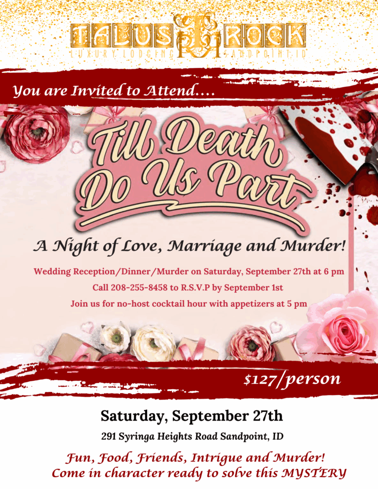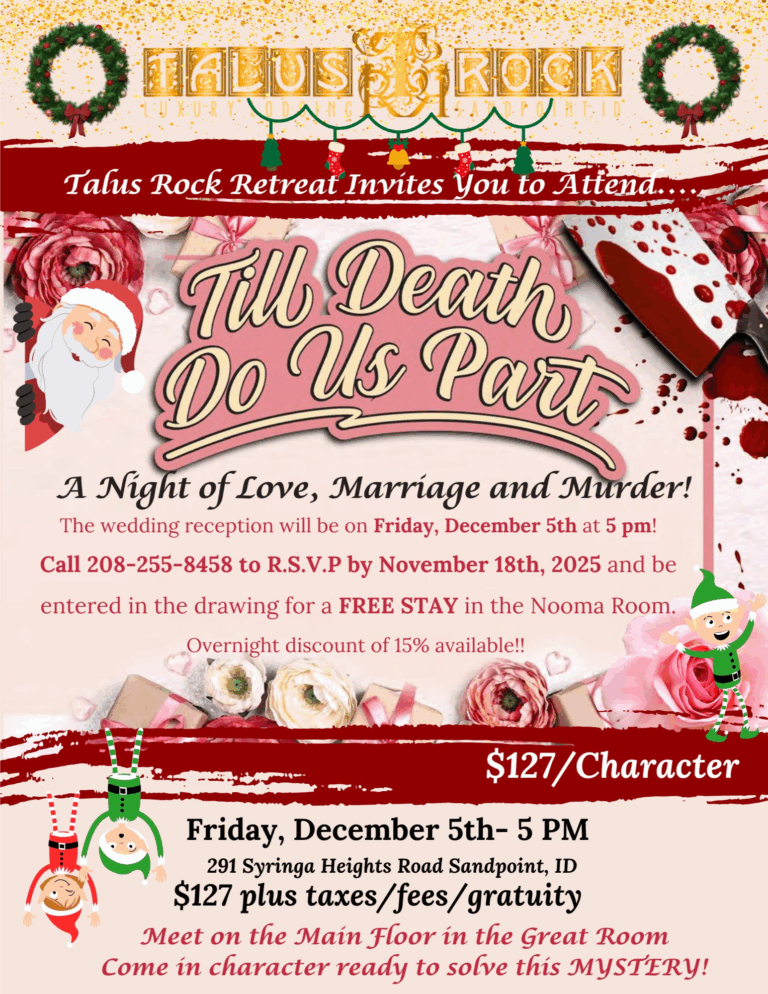 We had such a wonderful experience we decided to return with a much larger company in August of 2024 for another corporate retreat. Somehow Talus Rock exceeded the service they provided the last time we visited. From beginning to end (planning to completion of the retreat) the service, quality, and kindness was remarkable. They were organized, patient with me and all of my endless questions, and talented. We arranged a murder mystery dinner with Talus Rock for the Saturday night of the retreat. Talus Rock spent months perfecting the evening and it was very evident that their hard work paid off. We had a large group (just shy of 70 adults) and weeks before the event they individually contacted each participant providing a detailed synapsis of the evening, character details, costume recommendations, everything you could want. The attendees who flew in from all over (mostly from the US, portion of international guests) for the retreat were unbelievably excited for the evening. When the evening came Talus had set up the grounds more beautifully and elaborately than many weddings I had attended. Every detail from name tags, bakery purchased wedding cake (the murder mystery took place at a wedding), toasting beverages and cups and a phenomenal catered dinner during the “wedding,” accommodating all dietary restrictions were taken care of with perfection. I was nervous that such a large group would be difficult to engage in the experience. That was not the case, ALL attendants had a wonderful job and were appropriately integrated into the night. The evening had so much laughter and excitement that we didn’t want it to end. Can’t recommend this retreat center and event enough. We can’t wait to do it again. A million thanks to creating such bonding memories over the weekend. 6 out of 5 stars:). – Megan 2024